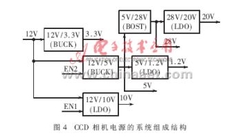 CCD 相機中的圖像信息的流動和變換是通過相機中的FPGA/CPLD時序發(fā)生器的驅動和MCU的控制管理下完成的。整個CCD相機正常工作需要以下6種穩(wěn)壓電源,它們的電壓值和最大輸出電流分別是:28V@30mA、20V@50mA、10V@100mA、5V@20mA、3.3V@300mA和1.2V@30mA。