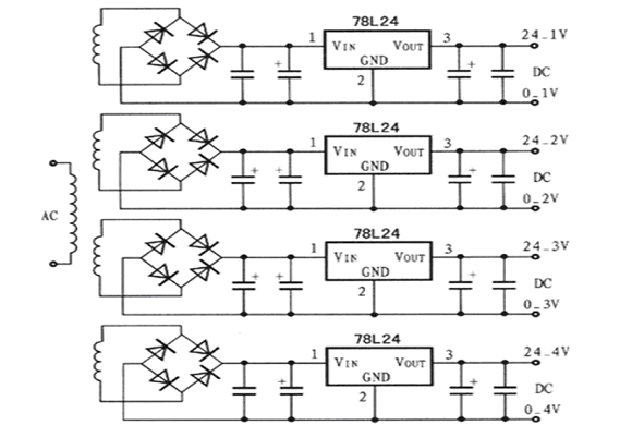 驅動電路需要4路相互隔離的直流電源為4路IGBT驅動電路供電,用220V/22V變壓器對4路交流電源分別整流,用電容器和78L24型電壓調整器穩(wěn)壓后輸出4路24V直流電壓,如圖2所示。