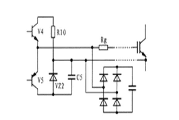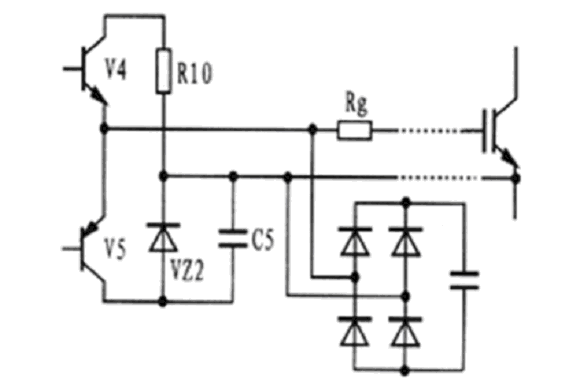 圖5所示為EXB841與IGBT柵-射極之間的連接電路原理圖。當驅動電路中的V4導通時,IGBT處于正常導通狀態(tài),當V5導通時,IGBT柵-射極之間通過穩(wěn)壓管VZ2提供一個-5V電壓加在其兩端,使IGBT關斷,此時V5處于臨界導通狀態(tài),穩(wěn)壓管VZ2處于反向偏置狀態(tài)。但由于集-柵極之間分布電容的影響,集-柵極之間的du/dt增大時,其通過分布電容形成的電流經(jīng)過,所以,要克服集-柵極之間的du/dt,確保穩(wěn)壓管不過壓,避免IGBT誤導通??朔u/dt的方法有二種:一是驅動電路輸出與IGBT柵-射極之間的連線采用雙絞屏蔽電纜,屏蔽層接地,二是采用快速吸收電路吸收過電壓。