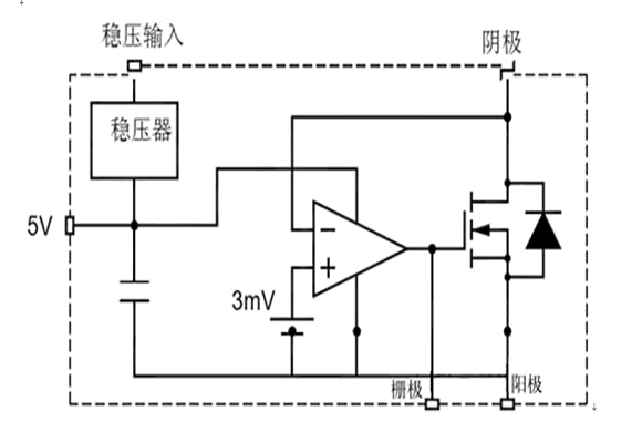實現(xiàn)與兩端整流器功能相當?shù)钠骷?,必須包括一個MOSFET,一個控制該器件以及內(nèi)部偏置電源的非??焖偾曳浅C舾械碾娐?。這樣的電路如圖1所示。