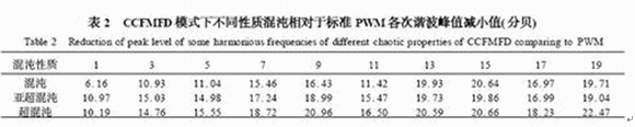 從表中給出的以標準周期PWM前19次諧波為參照的數(shù)據(jù)可以看出,分別在混沌、亞超混沌及超混沌信號調制下,各次諧波對應處的頻譜數(shù)值都得到了明顯的降低。在混沌信號調制下,諧波對應處的頻譜數(shù)值平均降低14.87分貝(dB);在亞超混沌信號調制下,諧波對應處的頻譜數(shù)值平均降低16.84分貝(dB);在超混沌信號調制下,諧波對應處的頻譜數(shù)值平均降低17.86分貝(dB)。若以歐盟(89/336/EEC指令)電磁兼容性導則中限制設備輸入電流諧波分量最大值幅度這一原則,來討論不同性質混沌信號降低電磁干擾水平的效果,結論非常明顯,即以超混沌信號作為開關調制信號源,比混沌能更好地降低電磁干擾水平。