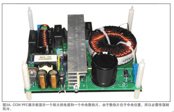 圖3A與3B顯示了兩個(gè)原型電源。圖3A是一個(gè)有正向轉(zhuǎn)換器進(jìn)行輸出穩(wěn)壓的單相CCM PFC及一個(gè)EMI濾波器。在此電源中,電感、大型濾波電容及散熱片體積均較大,位于中央位置,使電源體積略為龐大。圖3B是一個(gè)兩相交錯(cuò)式轉(zhuǎn)換TM PFC。交錯(cuò)式轉(zhuǎn)換電源非常薄,因?yàn)殡姼畜w積縮小了,輸出濾波器電容尺寸及布局均為散熱而考慮。如果布局采用同樣的規(guī)則,交錯(cuò)式轉(zhuǎn)換TM PFC也可以縮小體積。