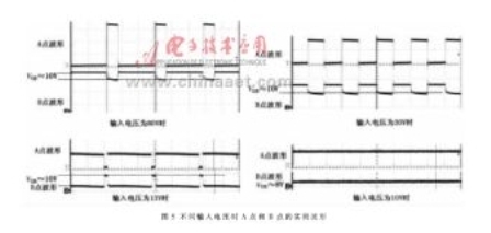 圖5為當(dāng)輸出電壓為10V、電流為2A時(shí),在不同輸入電壓狀態(tài)下,圖3中A點(diǎn)和B點(diǎn)的實(shí)測(cè)波形。由圖5可知,當(dāng)輸入電壓為13V時(shí),MOSFET關(guān)斷時(shí)間很短,當(dāng)輸入電壓為10V時(shí),MOSFET則一直導(dǎo)通。