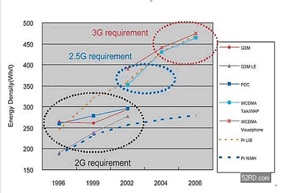 (圖二) 3G行動(dòng)電話(huà)對(duì)電池能量密度的規(guī)格需求