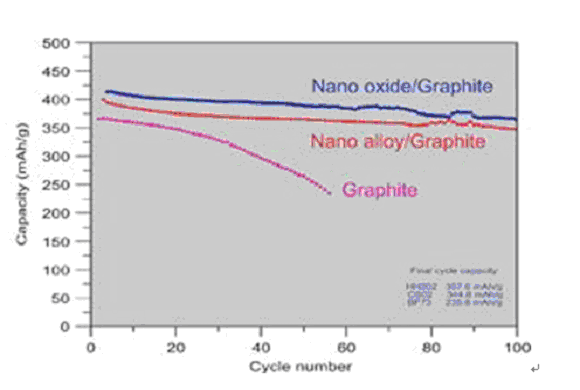 目前商品化的鋰電池負(fù)極材料,主要種類(lèi)包括石墨化碳、人工石墨、硬碳及碳纖維等。其中石墨化碳(如介穩(wěn)定相碳狀碳)的市場(chǎng)佔(zhàn)有率最高約30%,其材料價(jià)格高(每公斤30~32美金)、容量適中、壽命佳,目前被大量使用于鋰電池負(fù)極材料;然而其容量已達(dá)技術(shù)極限,非得使用更高容量的石墨碳材或合金材料,才能獲得高能量密度的鋰電池。目前高容量負(fù)極材料的開(kāi)發(fā),主要包括利用高能量機(jī)械合金化研磨(high-energy mechanical alloying) 技術(shù),將金屬或合金材料進(jìn)行高能量研磨,以獲得納米結(jié)構(gòu)金屬或合金材料;或?qū)⑻挤郾砻驽兩弦粚蛹{米氧化物及合金材料,以形成納米復(fù)合負(fù)極材料,如(圖三)。