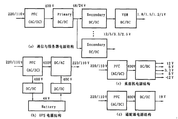 圖1(c)是桌面機(jī)(例如個(gè)人電腦)的電源結(jié)構(gòu)。先由PFC電路將市電變換成400V 的直流電壓,再經(jīng)過(guò)一個(gè)多路輸出的DC/DC 變換成多路的較低的直流電壓給不同負(fù)載供電。 圖1(d)是筆記本電腦適配器的電路結(jié)構(gòu)。 首先由PFC 將市電變換成400V的直流電壓,然后經(jīng)過(guò)一個(gè)DC/DC變換器降壓至19V(典型值)給負(fù)載供電。