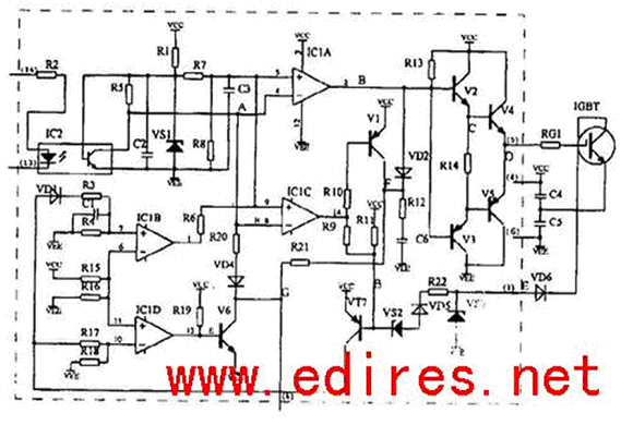 在M57962L輸入端13和14無電流時(shí),IC1截止,A點(diǎn)電位上升使IC2A的2腳變?yōu)榈碗娢唬瑒t使V3、V5導(dǎo)通,V2、V4截止。lGBT的門極(GATE)通過V5導(dǎo)通到VEE,而使IGBT關(guān)斷。IC2C的14腳輸出為低電平, 使V1、V7導(dǎo)通, 使IC2B、IC2D保持原先狀態(tài)不變。