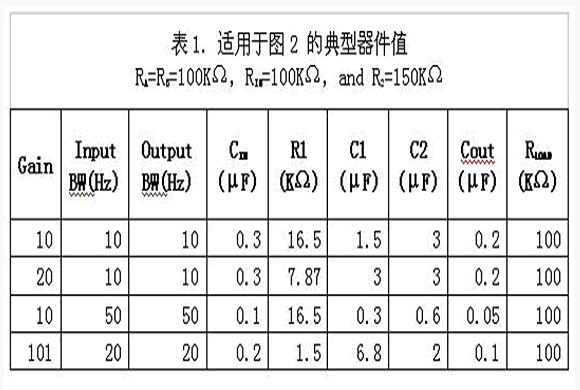 設(shè)計(jì)單電源運(yùn)算放大器電路,需要考慮輸入偏置電流誤差、電源抑制、增益、以及輸入與輸出線路帶寬等等。然而普通的應(yīng)用設(shè)計(jì)是可以通過查表來(lái)獲得,見表1。在單電源電壓為15V或12V時(shí)偏置分壓的兩個(gè)電阻通常選用100kΩ,這樣可以在電源消耗與輸入偏置電流誤差之間合理的折中。5V單電源偏置分壓電阻減小到一個(gè)比較低的值,例如42kΩ。還有些在3.3V應(yīng)用中偏置分壓電阻選在27kΩ左右。