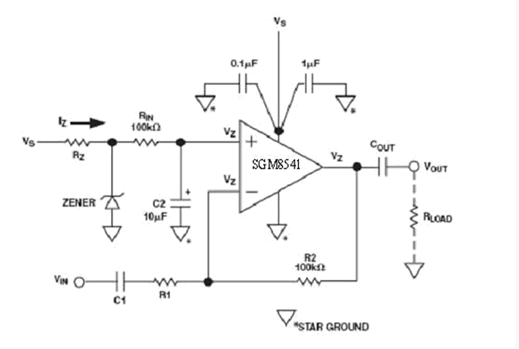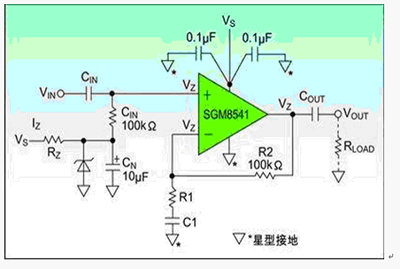 首先,電路的電源抑制幾乎沒有,電源電壓的任何變化都將直接通過兩個(gè)分壓電阻改變偏置電壓Vs/2,但電源抑制的能力是電路非常重要的特性。例如此電路的電源電壓1伏的變化,能引起偏置電路電壓的輸出Vs/2變化0.5伏。該電路的電源抑制僅僅只有6dB,通過選用SGM8541運(yùn)算放大器可以增強(qiáng)電源抑制能力。