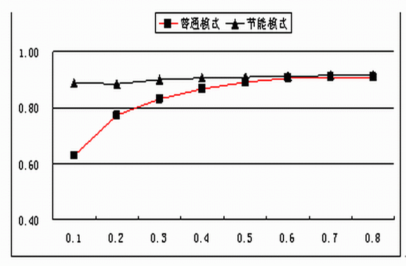 針對電源部分的損耗,戶外電源的工作模式和室內電源是一樣的,正常情況下為均流工作模式。市電正常時模塊負載率較低,電源系統(tǒng)大多數(shù)沒有工作在系統(tǒng)最佳效率區(qū)間,因此可以采用電源模塊休眠技術根據(jù)系統(tǒng)負載狀態(tài),動態(tài)調整工作模塊數(shù)量,使系統(tǒng)始終工作在最佳效率區(qū)間,從而降低系統(tǒng)的能耗。圖1表示了電源系統(tǒng)在普通工作模式下和節(jié)能模式下的系統(tǒng)典型效率比較。從圖1可看出,采用休眠節(jié)能模式,電源系統(tǒng)的效率在整個負載范圍內基本保持不變,有效的降低了電源系統(tǒng)在低負載條件下的能耗。另一方面,對于戶外電源來說,電源系統(tǒng)效率提高會降低設備倉的發(fā)熱量,降低設備倉的溫度。