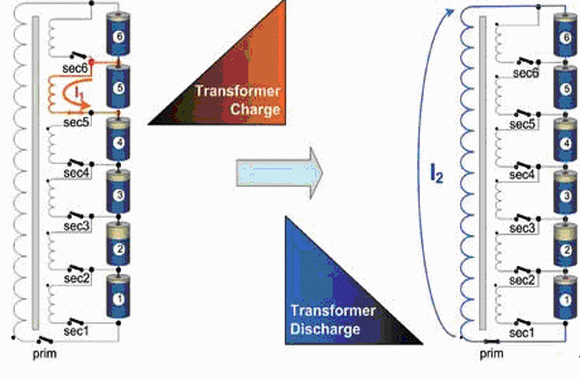閉合主繞組開關(guān),電池組向變壓器充電。然后斷開主繞組開關(guān),閉合相應(yīng)的次繞組開關(guān)(本例中為2號(hào)次繞組開關(guān)),變壓器儲(chǔ)存的能量轉(zhuǎn)移到指定的電池上。