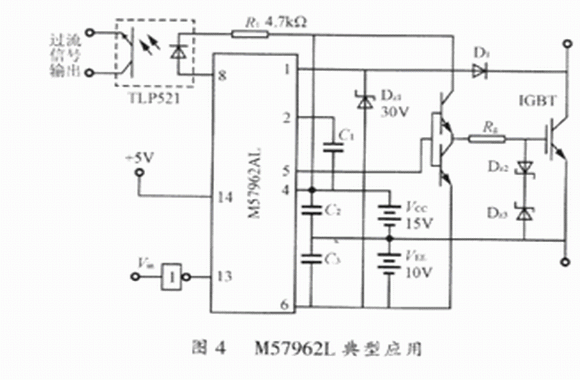 M5796AL具有高速的輸入輸出隔離,絕緣電壓也可達(dá)到AC 2500V/min;輸入電平與TTL電平兼容,適于單片機(jī)控制;內(nèi)部有定時(shí)邏輯短路保護(hù)電路,同時(shí)具有延時(shí)保護(hù)特性;采用雙電源供電方式,相對(duì)于EXB84l來說,雖然多使用一個(gè)電源.但I(xiàn)GBT可以更可靠地通斷。