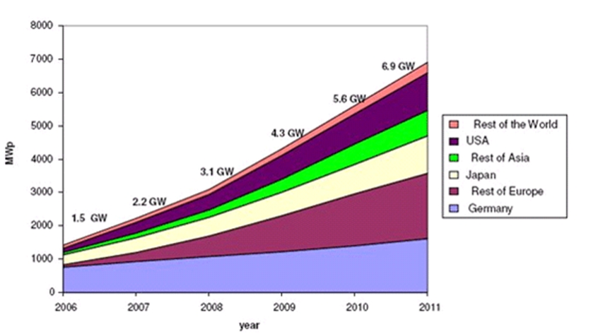中國政府在《可再生能源長期規(guī)劃》提出,太陽能光伏發(fā)電裝機(jī)容量到2010年將發(fā)展到450MWp,而2005年全國太陽能發(fā)電裝機(jī)容量僅為6.5MWp,這就意味著中國太陽能裝機(jī)容量的復(fù)合增長率將會高達(dá)38%以上。了解目前太陽能光伏市場發(fā)展動態(tài),把握太陽能光伏行業(yè)發(fā)展趨勢,對于半導(dǎo)體行業(yè)的發(fā)展是至關(guān)重要的。