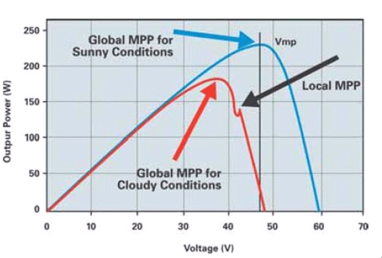 作為一種替代解決方案,人們提出了一種增量自感算法,通過定義一個峰值,然后,求解功率曲線的微分,從而得出MPP點(diǎn)。雖然這種方法沒有因?qū)挿秶袷幰鸬牡托蕟栴},但是,它存在把本地峰值誤設(shè)為MPP點(diǎn)的可能。