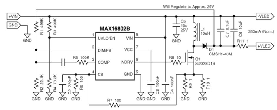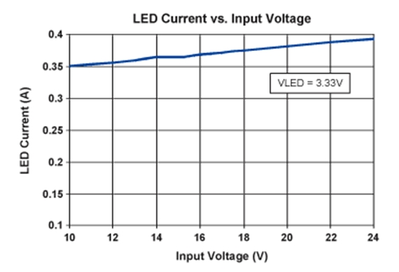 • 為單個3.3V LED供電,提供350mA (典型)電流(其它LED配置結構,請按照設計步驟進行設計)