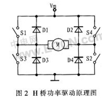 直流電機(jī)驅(qū)動(dòng)使用最廣泛的就是H型全橋式電路,這種驅(qū)動(dòng)電路方便地實(shí)現(xiàn)直流電機(jī)的四象限運(yùn)行,分別對應(yīng)正轉(zhuǎn)、正轉(zhuǎn)制動(dòng)、反轉(zhuǎn)、反轉(zhuǎn)制動(dòng)。H橋功率驅(qū)動(dòng)原理圖如圖2所示。