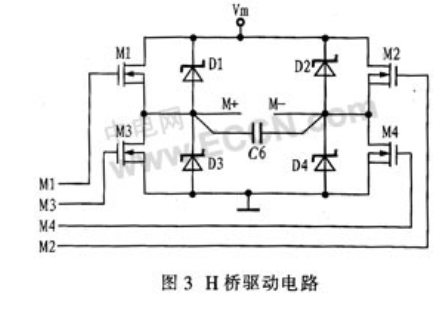 相對來說,利用2個(gè)N溝道功率MOSFET和2個(gè)P溝道功率MOSFET驅(qū)動(dòng)電機(jī)的方案,控制電路簡單、成本低。但由于加工工藝的原因,P溝道功率MOSFET的性能要比N溝道功率MOSFET的差,且驅(qū)動(dòng)電流小,多用于功率較小的驅(qū)動(dòng)電路中。而N溝道功率MOSFET,一方面載流子的遷移率較高、頻率響應(yīng)較好、跨導(dǎo)較大;另一方面能增大導(dǎo)通電流、減小導(dǎo)通電阻、降低成本,減小面積。綜合考慮系統(tǒng)功率、可靠性要求,以及N溝道功率MOSFET的優(yōu)點(diǎn),本設(shè)計(jì)采用4個(gè)相同的N溝道功率MOSFET的H橋電路,具備較好的性能和較高的可靠性,并具有較大的驅(qū)動(dòng)電流。其電路圖如圖3所示。圖中Vm為電機(jī)電源電壓,4個(gè)二極管為續(xù)流二極管,輸出端并聯(lián)一只小電容C6,用于降低感性元件電機(jī)產(chǎn)生的尖峰電壓。