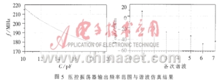 式中,fm為頻偏,KVCO為VCO控制靈敏度,fo為振蕩頻率,Q為品質(zhì)因數(shù),F為晶體管的噪聲系數(shù),K為波爾茲曼常數(shù),T為工作溫度,Ps為振蕩信號功率,fc為閃爍噪聲拐角頻率,Vm為低頻噪聲源的總幅度。從式(5)可以看出,選擇噪聲系數(shù)小的放大管、增加諧振回路有載Q值、減小VCO控制靈敏度、提高輸出信號功率都可以降低相位噪聲。通過減小變?nèi)莨茉谥C振回路中的接入系數(shù),可以有效減小VCO控制靈敏度,但是也會導(dǎo)致頻率覆蓋范圍的減小,所以要適當(dāng)選擇接入系數(shù)。該VCO輸出頻率為200MHz時,變?nèi)莨芙尤胂禂?shù)為0.63。通過適當(dāng)調(diào)整輸出回路的電感和分壓電容,可以提高負(fù)載阻抗,從而有效地提高輸出功率,以達(dá)到降低相位噪聲的目的。通過軟件仿真,在頻偏10kHz處的輸出相位噪聲為-101.3dBc/Hz,在100kHz處的相位噪聲為-122.5dBc/Hz。