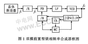 圖1中,(P+1)/P為高速雙模前置分頻器,分頻模數(shù)為P+1和P;A為吞脈沖可編程計數(shù)器;B為主可編程計數(shù)器;MC為??刂七壿嬰娐贰F浞诸l比為N=(P+1)A+P(B-A)=PB+A (1)