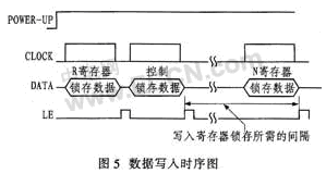 數(shù)據(jù)寫入時序:DATA在每個CLOCK的上升沿從MSB(最高有效位)開始依次寫入24位移位寄存器中的數(shù)據(jù)并一次鎖存到目標寄存器,再開始下一個目標寄存器的初始化。目標寄存器選取由移位寄存器中的DB1、DB0決定。對寄存器賦值順序為R,C、N。C寄存器和N寄存器賦值間隔應大于5 ms,數(shù)據(jù)寫入時序如圖5所示。