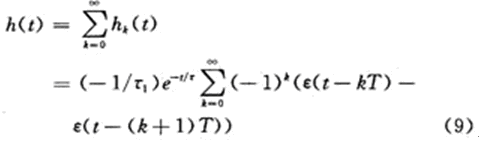 由式(8)可見,第k段的非零值時區(qū)為(kT,(k+1)T_),即各時段非零值區(qū)間互不重疊,對hk(t)關(guān)于k求和,得開關(guān)電容電路(對外)的單位沖激零狀態(tài)響應h(t)為: