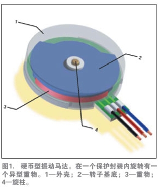 多數(shù)振動馬達(dá)由一個較小的電動馬達(dá)驅(qū)動一個偏心配重,如圖1所示。馬達(dá)分為直流有刷或無刷電機(jī),有兩種基本的結(jié)構(gòu):硬幣狀(扁平)與圓柱形(條狀)。
