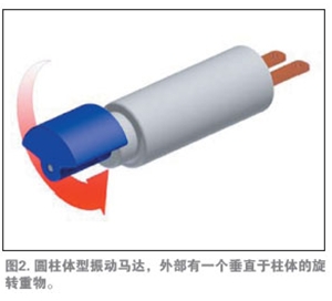 柱型馬達(dá)是采用傳統(tǒng)軸向設(shè)計的簡單有刷電機(jī),如圖2所示。用于多種應(yīng)用中,但由于體積較大,不適合在手機(jī)中應(yīng)用。柱型馬達(dá)在手機(jī)中需要較大的空間,直徑是所有振動馬達(dá)中最大的。