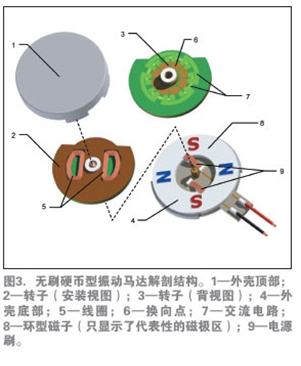 如前所述,無刷電機(jī)具有較長的壽命,并由于產(chǎn)生的電火花較少,也沒有了RFI干擾。無刷直流(BLDC)設(shè)計還提供業(yè)內(nèi)直徑最小、厚度最薄的扁平振動馬達(dá)。圖4介紹了這種馬達(dá)的基本構(gòu)造。