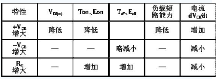 IGBT 的驅(qū)動條件與它的靜態(tài)和動態(tài)特性密切相關。柵極的正偏壓+VGE、負偏壓-VGE 和柵極電阻RG 的大小,對IGBT 的通態(tài)電壓、開關時間、開關損耗、承受短路能力以及dVCE/dt等參數(shù)都有不同程度的影響。門極驅(qū)動條件與器件特性的關系如表1 所示。