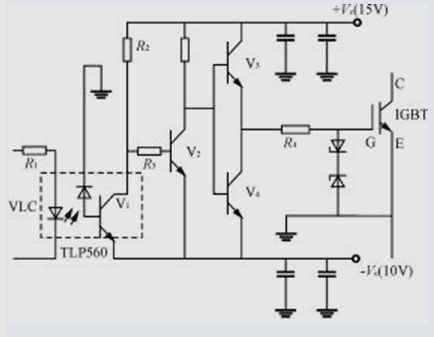 圖3為采用光耦合器等分立元器件構(gòu)成的IGBT驅(qū)動(dòng)電路。當(dāng)輸入控制信號(hào)時(shí),光耦VLC導(dǎo)通,晶體管V2截止,V3導(dǎo)通輸出+15V驅(qū)動(dòng)電壓。當(dāng)輸入控制信號(hào)為零時(shí),VLC截止,V2、V4導(dǎo)通,輸出-10V電壓。+15V和-10V電源需靠近驅(qū)動(dòng)電路,驅(qū)動(dòng)電路輸出端及電源地端至IGBT柵極和發(fā)射極的引線(xiàn)應(yīng)采用雙絞線(xiàn),長(zhǎng)度最好不超過(guò)0.5m。