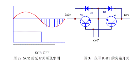 旁路開關(guān)常使用繼電器和可控硅。繼電器在中小功率的UPS 中廣泛應(yīng)用。優(yōu)點(diǎn)是控制簡單,成本低,缺點(diǎn)是繼電器有轉(zhuǎn)換時(shí)間,還有就是機(jī)電器件的壽命問題??煽毓璩R娪谥写蠊β蔝PS 中。優(yōu)點(diǎn)是控制電流大,沒有切換時(shí)間。但缺點(diǎn)就是控制復(fù)雜,且由于可控硅的觸發(fā)工作特性,在觸發(fā)導(dǎo)通后要在反向偏置后才能關(guān)斷,這樣就會(huì)產(chǎn)生一個(gè)最大10ms 的環(huán)流電流,如圖2。如果采用IGBT,如圖3,則可以避免這個(gè)問題,使用IGBT 有控制簡單的優(yōu)點(diǎn),但成本較高。其工作原理為:當(dāng)輸入為正半周時(shí),電流流經(jīng)Q1、D2,負(fù)半周時(shí)電流流經(jīng)D1、Q2。