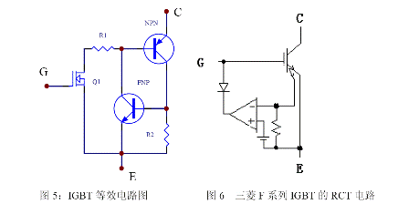 IGBT 有一定抗過電流能力,但必須注意防止過電流損壞。IGBT 復(fù)合器件內(nèi)有一個(gè)寄生晶閘管,所以有擎住效應(yīng)。圖5 為一個(gè)IGBT 的等效電路,在規(guī)定的漏極電流范圍內(nèi),NPN 的正偏壓不足以使NPN 晶體管導(dǎo)通,當(dāng)漏極電流大到一定程度時(shí),這個(gè)正偏壓足以使NPN 晶體管開通,進(jìn)而使NPN 和PNP 晶體管處于飽和狀態(tài),于是寄生晶閘管開通,門極失去了控制作用,便發(fā)生了擎住效應(yīng)。IGBT 發(fā)生擎住效應(yīng)后,漏極電流過大造成了過高的功耗,最后導(dǎo)致器件的損壞。