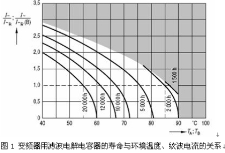 圖1為變頻器用濾波電解電容器的壽命與環(huán)境溫度、紋波電流的關(guān)系(日立電解電容器的數(shù)據(jù)表中沒(méi)有給出這樣的曲線)。