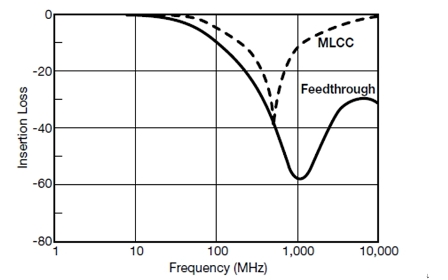 對于寄生參數(shù)來說,這種幾何結構具有幾個有趣的問題。首先,電容器的寄生電感要比具有等效電容的相當尺寸的片式電容器要小得多??梢詼y量穿心電容的寄生電感,大約為250pH。該相同的現(xiàn)象是在降低了電感的同時也降低了ESR(通道長度,通道長度,通道長度!)最后,穿通部分中電感的引入將增加衰減帶寬。圖8給出了一只100pF的穿心電容和一個等效的標準片式電容之間的插入損耗比較。