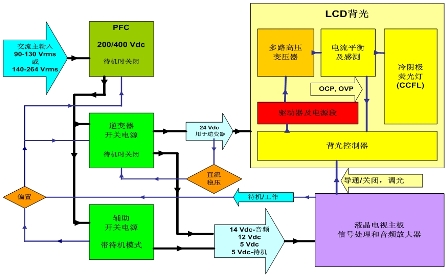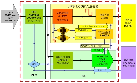 圖2:安森美半導(dǎo)體針對32英寸液晶電視的全橋高壓LIPS解決方案功能框圖。