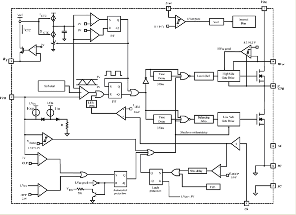飛兆半導(dǎo)體的集成式“Green FPS”功率開關(guān)FSFA2100系列是專門針對不對稱半橋轉(zhuǎn)換器設(shè)計而開發(fā)的一種技術(shù)。這種技術(shù)在單個器件中整合了PWM控制器、高端驅(qū)動和SuperFET,只需要極少數(shù)量的外部元件。圖3所示為其內(nèi)部模塊示意圖。在大功率轉(zhuǎn)換器應(yīng)用中,PCB版圖設(shè)計一向是棘手部分,因為在布局時,為了把噪聲干擾降至最低,必需讓柵極驅(qū)動器和控制電路盡可能地靠近MOSFET。FSFA2100把柵極驅(qū)動器及控制電路與MOSFET集成在一起,使這些器件之間的距離最小化,從而大幅減小了終端應(yīng)用的噪聲干擾。此外,這樣做也減少了寶貴的設(shè)計時間,使生產(chǎn)力得以提高。