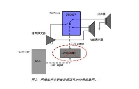 此外,英聯(lián)電子的低ICCT系列模擬開關(guān)具有更低的VIH電平值,可以采用較低的控制電平實現(xiàn)開關(guān)的高電平切換控制。這種特性大大減少了電路復(fù)雜性,特別是在供電電源和控制信號電平不匹配的便攜產(chǎn)品應(yīng)用中,可省去電平轉(zhuǎn)換模塊,從而有效降低了成本。以圖3所示的模擬開關(guān)切換音頻信號為例,如果采用ASIC輸出的1.8V電平作為UM3157控制管腳的輸入,則不必采用電平轉(zhuǎn)移器,就能在漏電流很小的情況下實現(xiàn)開關(guān)切換。此外,由于低ICCT模擬開關(guān)的電流功耗很低(大約1uA),且開關(guān)的導(dǎo)通電阻隨工作電壓的增加而降低,所以可以采用較高的供電電壓來實現(xiàn)更低的導(dǎo)通電阻。低導(dǎo)通電阻對典型的音頻開關(guān)或USB應(yīng)用而言非常重要。