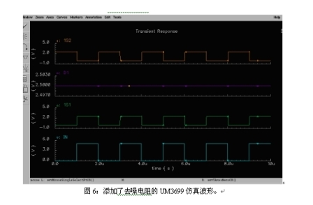 圖5是沒有采用去噪聲電阻時模擬開關(guān)的仿真波形圖。D1為輸入的數(shù)據(jù)信號。IN為選擇端信號。當(dāng)IN為高電平時,開關(guān)通向1S1;當(dāng)IN為低電平時,開關(guān)通向1S2。當(dāng)開關(guān)斷開時,由于寄生電容和選擇端切換脈沖的存在,開關(guān)到地之間是高阻態(tài),所以寄生電容的電荷沒有放電回路。這樣,開關(guān)的關(guān)斷端在較長的時間內(nèi)將出現(xiàn)一個比輸入數(shù)據(jù)信號更高的電平,從而導(dǎo)致噪聲。圖6是采用圖4中的去噪電阻后開關(guān)切換的仿真波形圖。由于開關(guān)斷開后連接了去噪電阻上,形成一個對地的放電回路,所以寄生電容上的電荷得以很快釋放,從而消除了開關(guān)切換時的干擾電平,提高了開關(guān)在音頻切換應(yīng)用時的聲音質(zhì)量。