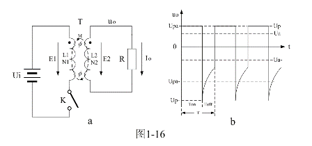 圖1-16-a是單激式變壓器開關(guān)電源的最簡(jiǎn)單工作原理圖。圖1-16-a中,Ui是開關(guān)電源的輸入電壓,T是開關(guān)變壓器,K是控制開關(guān),R是負(fù)載電阻。