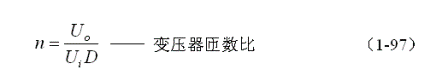 正激式開(kāi)關(guān)電源輸出電壓一般是脈動(dòng)直流的平均值,而脈動(dòng)直流的平均值與控制開(kāi)關(guān)的占空比有關(guān),因此,在計(jì)算正激式開(kāi)關(guān)電源變壓器初、次級(jí)線圈的匝數(shù)比之前,首先要確定控制開(kāi)關(guān)的占空比D,把占空比D確定之后,根據(jù)(1-77)式就可以計(jì)算出正激式開(kāi)關(guān)電源變壓器的初、次級(jí)線圈的匝數(shù)比: