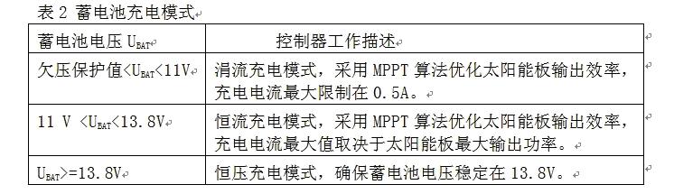 當(dāng)系統(tǒng)檢測到環(huán)境光充足,控制器就會進入充電模式。蓄電池充電有兩個比較重要的電壓值:深度放電電壓和浮充充電電壓。前者代表在正常使用情況下蓄電池電能被用完的狀態(tài), 而后者則代表蓄電池充電的最高限制電壓,這些參數(shù)應(yīng)該從蓄電池產(chǎn)品手冊上可以查到。在設(shè)計電路中針對12V蓄電池,分別設(shè)置深度放電電壓為11V和浮充充電電壓為13.8V(皆為在室溫條件下的電壓值,軟件中這兩個值增加了相應(yīng)的溫度補償),具體充電模式如表2所示。
