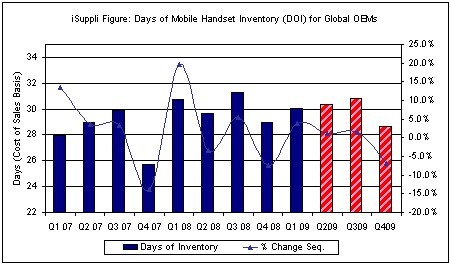 第三季度,iSuppli公司預(yù)測(cè)手機(jī)市場(chǎng)將恢復(fù)增長(zhǎng),銷售額將比第二季度上升7.8%。這種增長(zhǎng)主要來源于訂單增加,此前訂單接近停滯。另外,庫存將上升5%左右。iSuppli公司預(yù)測(cè),需求與庫存的相應(yīng)增長(zhǎng)將使庫存天數(shù)保持在30天左右。