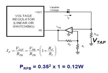 考慮運(yùn)算放大器本身的功耗,RFB及其附屬電路的功耗大約為1WLED功率的12%。這樣就能在確保LED獲得恒流供電的同時(shí),將RFB的功耗降低到可以接受的水平,從而使LED兩端的電壓盡可能大,流經(jīng)的電流也盡可能大。國(guó)家半導(dǎo)體按照這個(gè)原理工作的穩(wěn)壓器有LM2736和LM2734。