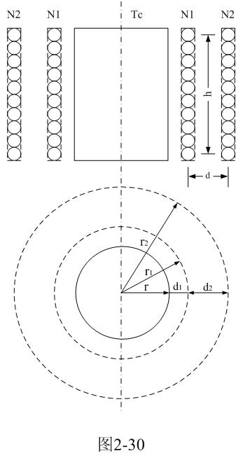 在圖2-30中,N1、N2分別為變壓器的初、次級(jí)線圈,Tc是變壓器鐵芯。r是變壓器鐵芯的半徑,r1、r2分別是變壓器初、次級(jí)線圈的半徑;d1為初級(jí)線圈到鐵芯的距離,d2為初、次級(jí)線圈之間的距離。為了分析計(jì)算簡(jiǎn)單,這里假設(shè)變壓器初、次級(jí)線圈的匝數(shù)以及線徑相等,流過(guò)線圈的電流全部集中在線徑的中心;因此,它們之間的距離全部是兩線圈之間的中心距離,如虛線所示。