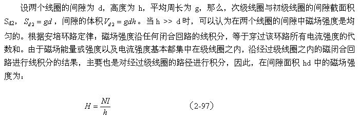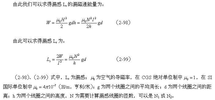 如果我們拿(2-99)式與(2-67)式或(2-94)式進(jìn)行對(duì)比,可以看出,線圈漏感與線圈的電感是沒(méi)有本質(zhì)區(qū)別的,只是磁路和磁通密度以及介質(zhì)導(dǎo)磁率等參數(shù)需要根據(jù)實(shí)際情況來(lái)決定。