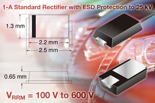 新器件的目標(biāo)應(yīng)用是汽車和工業(yè)控制、傳感器單元,以及照明系統(tǒng)。設(shè)計者可以根據(jù)所需,從100V(MSE1PB)、200V(MSE1PD)、400V(MSE1PG)和600V(MSE1PJ)中挑選合適的反向電壓等級。所有這些器件都具有1A的平均前向電流和20A的前向浪涌電流。