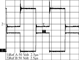 開關(guān)管S1和S的Uds波形如圖3所示,RefA為S管壓降波形,50V/div,RefB為S1管壓降波形,50V/div。電路此時(shí)工作在Vin=60V左右,S1和S的開關(guān)應(yīng)力大概為120V,D=0.5左右。圖4為變壓器輸出電壓,也就是同步整流管SR1和SR的驅(qū)動(dòng)信號(hào),正的部分為SR的驅(qū)動(dòng)信號(hào),負(fù)的部分為SR1的驅(qū)動(dòng)信號(hào)。實(shí)驗(yàn)所得波形和分析的波形基本吻合,只是在開關(guān)轉(zhuǎn)換瞬間,電壓有小尖峰,這是由電路的雜散參數(shù)引起的。該電路的工作效率經(jīng)過(guò)測(cè)量大約在90%左右,基本達(dá)到設(shè)計(jì)的要求。
