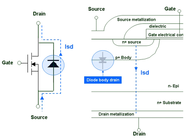 圖2:MOSFET器件的截面圖,電流流經(jīng)其內(nèi)部的體二極管[page]