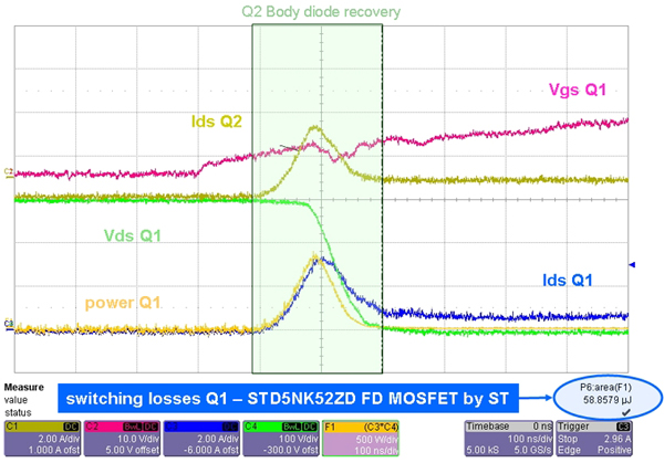 我們對比測試了標準的MOSFET和快恢復MOSFET。ST推出的STD5NK52ZD(SuperFREDmesh系列)放在Q2(LF)中,如圖4b所示。在Q1MOSFET(HF)的導通工作期間,開關損耗降低了65%。采用STD5NK52ZD時效率和熱性能獲得很大提升(在不采用散熱器的自由流動空氣環(huán)境下,殼溫從60°C降低到50°C)。在這種拓撲中,MOSFET內(nèi)部的體二極管用作續(xù)流二極管,采用具有快速體二極管恢復特性MOSFET更為合適。