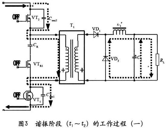 2)諧振階段(t1~t2),如圖3所示,在占空比的控制下,第一主開關(guān)管VT1和第二主開關(guān)管VT2在t1時刻同時關(guān)斷,變壓器磁芯極性反轉(zhuǎn)。因輸入電源和變壓器的勵磁電感的作用給VT1和VT2的寄生電容COSS1,COSS2充電,由于電容電壓不能突變,第一主開關(guān)管VT1和第二主開關(guān)管VT2在ZVS狀態(tài)下關(guān)斷。同時變壓器的勵磁電流開始給鉗位開關(guān)管VTR1的寄生電容COSS放電,經(jīng)VTR1的體二極管給鉗位電容CR1充電。次級VD1截止,VD2導(dǎo)通,L1經(jīng)過VD2續(xù)流繼續(xù)給負載RL供電。